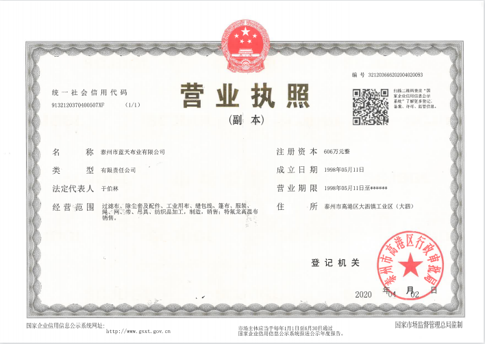 公司專業從事紡織業生產已三十多年,已成為一家從紡絲、織造、后整理到后加工一條龍的企業。公司位于江蘇省泰州市高港區大泗工業園區,交通方便,占地100余畝,擁有現代化標準廠房,現有員工120人,年產過濾布300萬米、除塵布袋600萬米、縫包線、長絲線4...